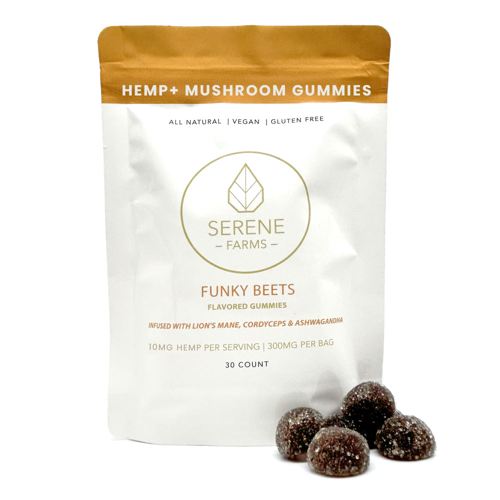 Serene Farms NEW Funky Beets Hemp Extract + Mushroom Infused Gummies are here! Our proprietary blend of functional mushrooms plus organic hemp extract supports mental health while keeping you calm, clear and grounded. Great for day or night time use.
